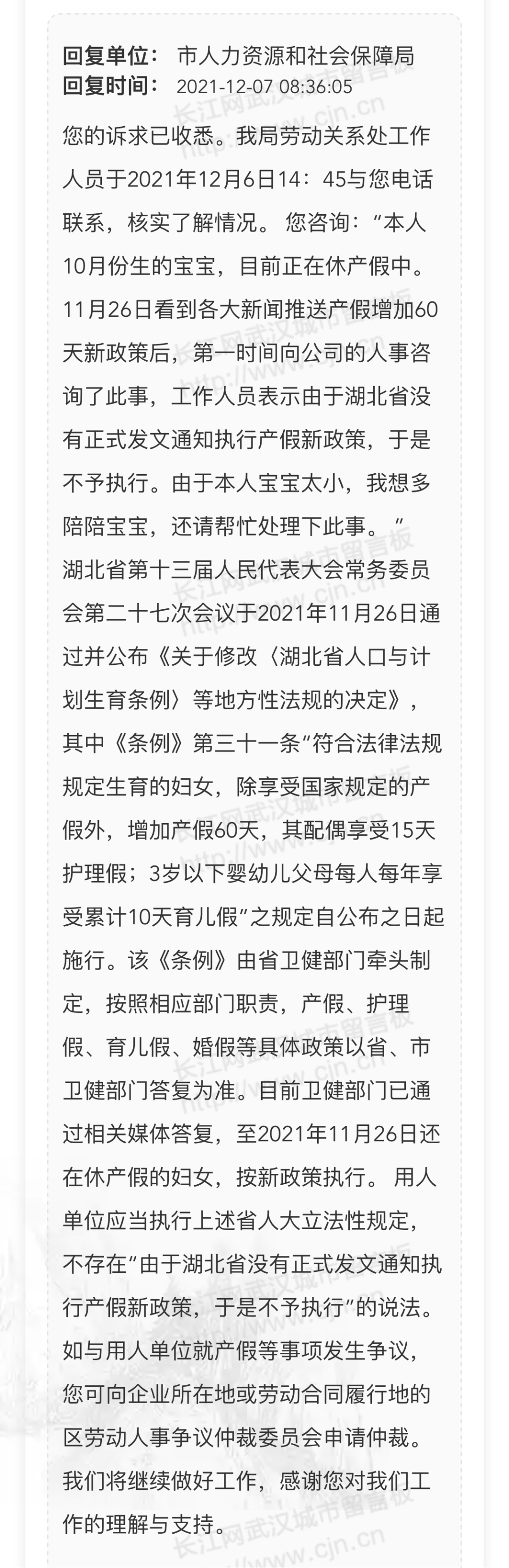 记者注意到,针对网友的上述反映,武汉市人社局劳动关系处工作人员在武汉城市留言板上回复称,《条例》第三十一条“符合法律法规规定生育的妇女,除享受国家规定的产假外,增加产假60天,其配偶享受15天护理假;3岁以下婴幼儿父母每人每年享受累计10天育儿假”之规定自公布之日起施行。