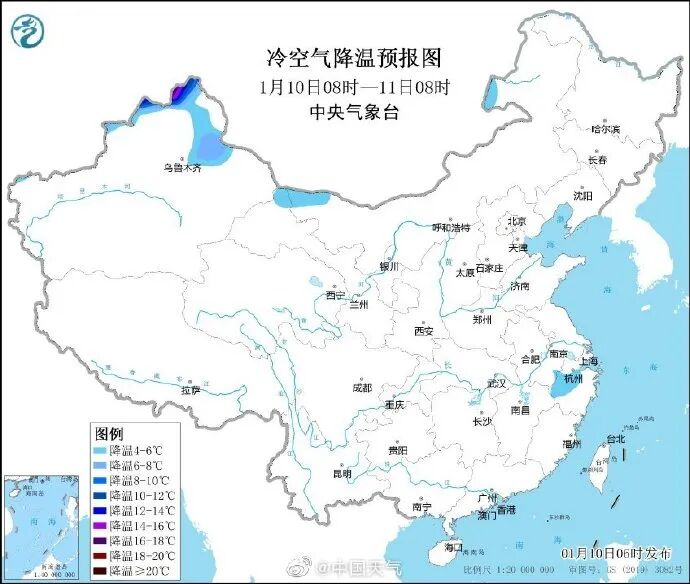 11日至12日,新疆、甘肃、青海降温6~12℃,新疆北部、甘肃西部14~18℃,阿勒泰北部超过20℃,风力4~6级,山口风力可达8~10级;12日夜间至15日,中东部大部地区将先后出现6~12℃降温,内蒙古、东北地区、江汉东部、江淮、江南、贵州等地降温14~18℃,东北地区中北部超过20℃,风力4~5级,阵风6~8级。我国大部海域将有7~8级,阵风9~10级大风,渤海9~11级。17日早晨过程最低气温0℃线位于云南东部至贵州、江南南部一线,-10℃线位于华北中南部、陕西南部一线。