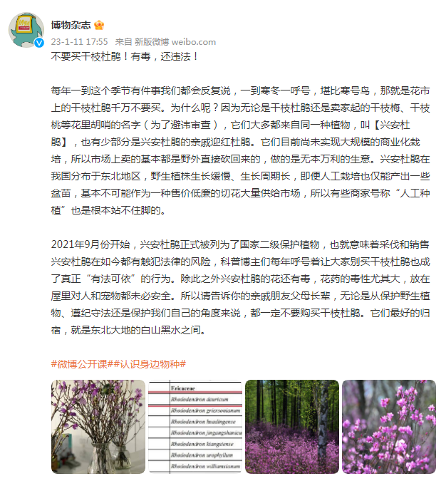 1月11日,知名科普博主@博物杂志发微博提醒:不要买干枝杜鹃!有毒,还违法!