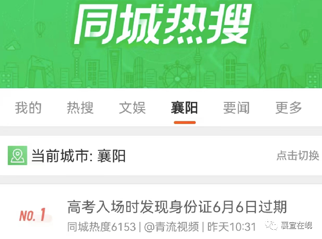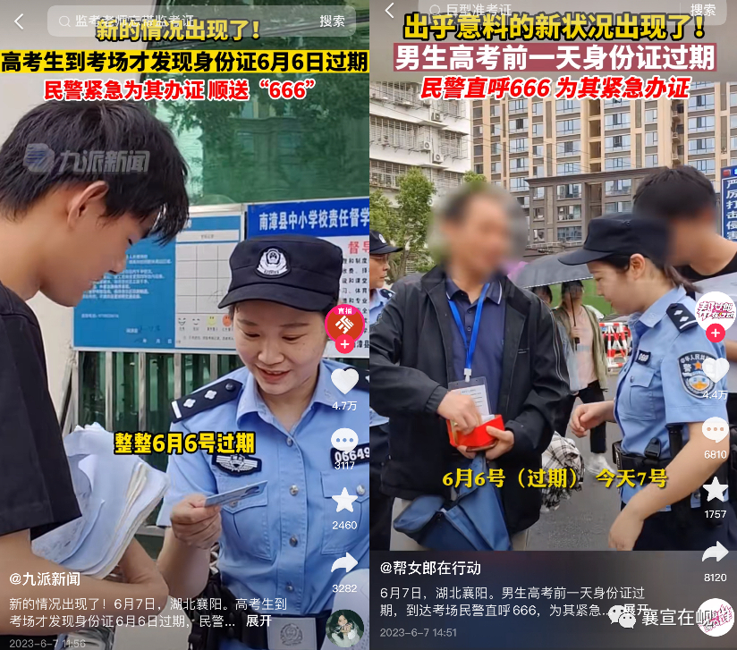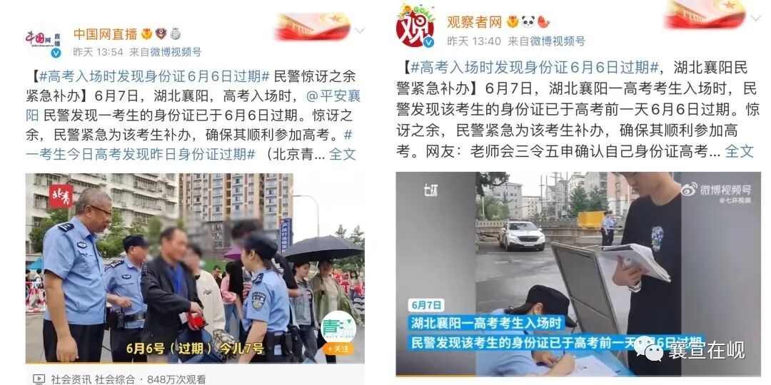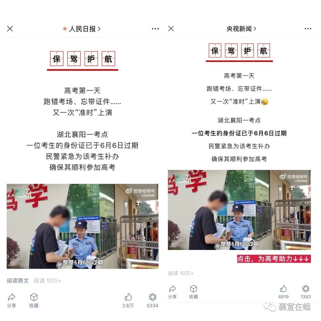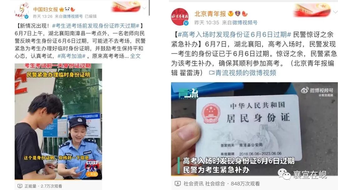 6月7日,“襄阳南漳一考生身份证6月6日过期,民警紧急补办,确保顺利参加高考”,这一暖新闻经人民日报、央视新闻、北京青年报、环球网等各大主流媒体转载推送,截至目前全网阅读量已达8亿(含新浪微博5亿,微信视频号、抖音平台阅读量过3亿,人民日报微信文章10万+、央视新闻微信文章10万+),全方位、多渠道地传播推送,引发网友盛赞襄阳为:有情有义襄阳城。