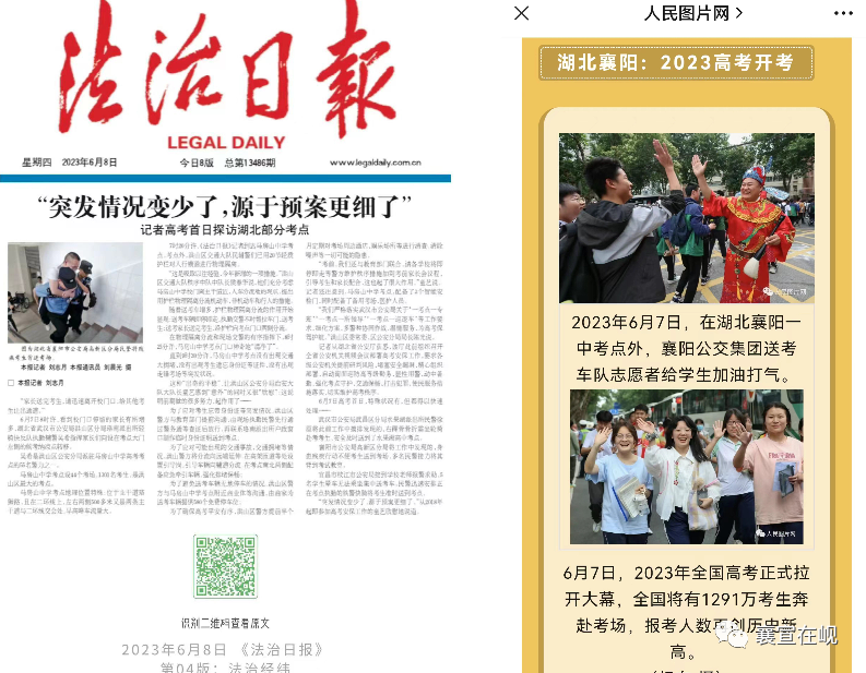 6月8日,《法治日报》头版头条刊发《突发情况更少了,源于预案更细了》,还报道了襄阳高新区公安分局多名民警接力,帮助患疾行动不便考生按时参考。