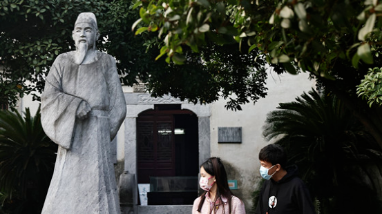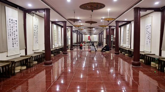 仰高堂里正在举办书法讲座,孩子们拿着小小的毛笔,饱蘸浓墨,预备小试身手。天蓝地绿,可以看见,他们正在进入一个新的世界,唯美静谧的黑白世界。