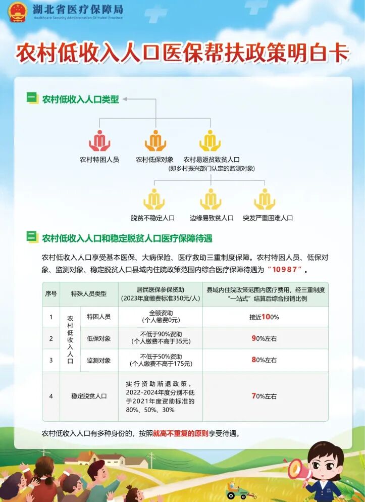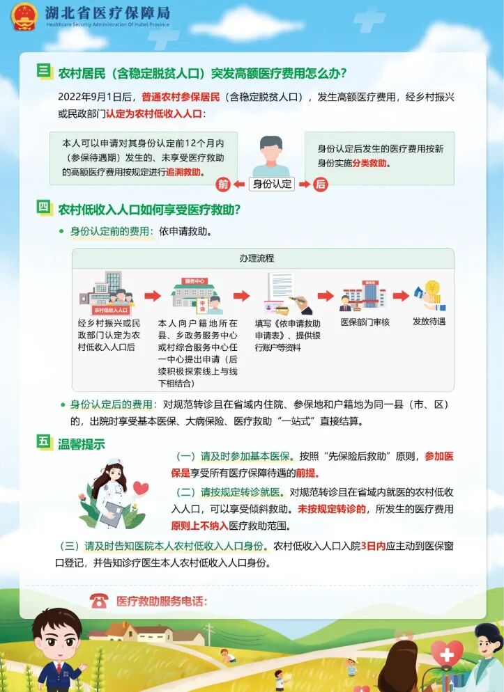为减轻农村低收入人口等困难群众高额医疗费用负担,充分发挥医疗保障帮扶在防范化解困难群众因病致贫中的关键性作用,湖北医保精心梳理制作了《农村低收入人口医保帮扶政策明白卡》,当您突发高额医疗费用影响家庭基本生活时,可按流程申请办理医疗救助,有效减轻医疗费用负担。