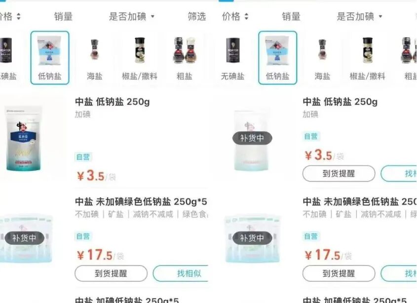 另外,多个生鲜电商平台上,低钠盐、无碘盐显示“缺货”“补货中”。一位消费者表示:“一款低钠盐一分钟前看还有货,再一滑就显示缺货了。”