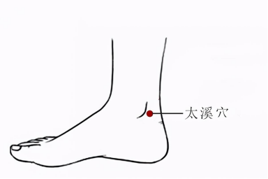 太溪穴:位于足内侧,内踝后方与脚跟骨筋腱之间的凹陷处。