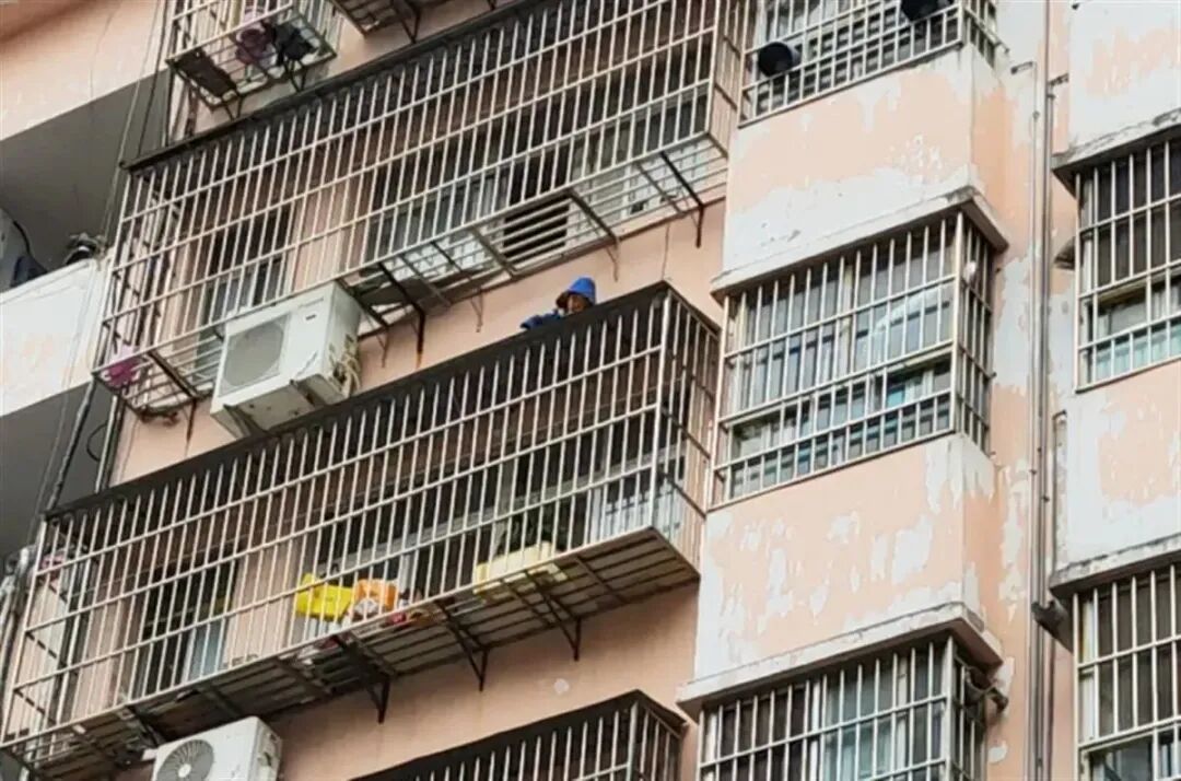 民警到达现场后,发现该居民楼5楼防盗网上正蹲着一名身穿蓝色上衣的小孩。此时天空正下着小雨,由于遮阳棚有一定向下倾斜角度,在防盗网顶部遮阳棚上的小男孩摇摇欲坠,随时都可能掉下来,小孩的情绪非常不稳定,场面危急,救援刻不容缓。