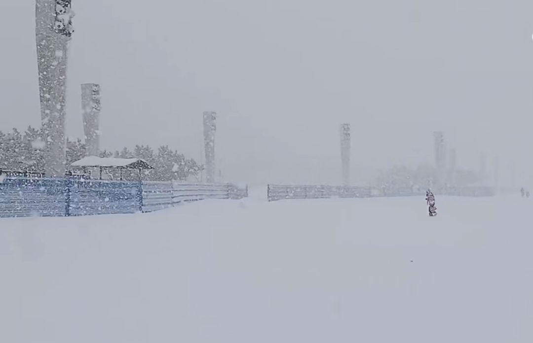 烟台大学东门附近,冷流雪正在狂暴,宛如北极科考。微博网友视频截图