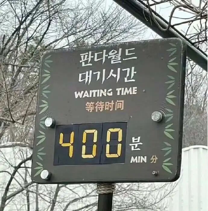 此外有网友发帖称,进入爱宝乐园后,熊猫世界等待时间指示牌上写着“400分钟”,即入场后也要等6小时40分钟才能看到“福宝”。