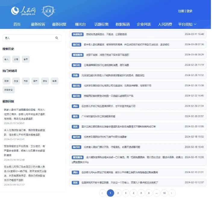 人民网“人民投诉”平台上涉及老年人上当受骗的各类投诉层出不穷。“人民投诉”平台网页截图