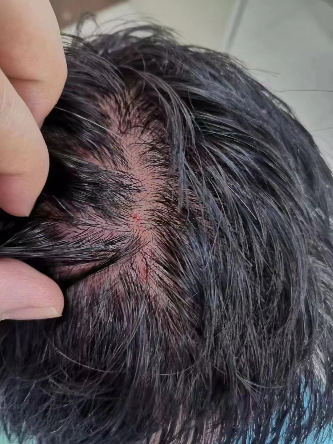 来到湖北省中医院光谷院区急诊科时,熊先生的整个头部都红肿、多处渗血,还伴随有强烈的火烧样、针刺样疼痛。接诊的急诊外科宋小龙主治医师仔细查看了熊先生头部的蜇伤,并未发现有蜂刺残留,又看了带过来的蜂虫尸体,判断蜇人的是马蜂。
