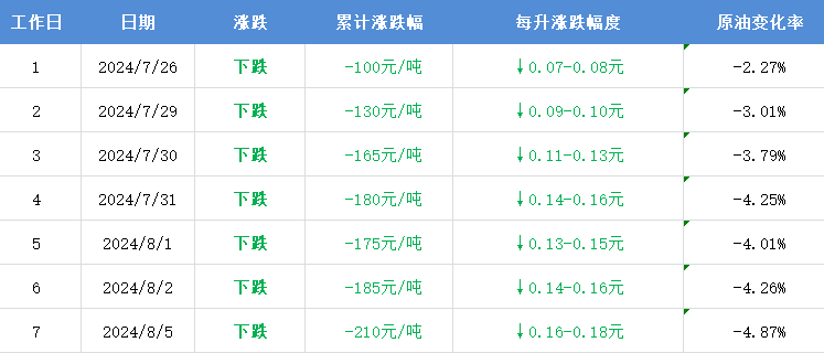 8月5日,本轮国内油价计价统计周期已过去7个工作日,今日参考原油变化率-4.87%,预计汽柴油下调210元/吨,折算为每升油价下跌0.16元到0.18元,按照油箱容量为50L的家用轿车为例,加满一箱92号汽油,将少花8元到9元。调价日期:8月8日24时(周四晚12点)。