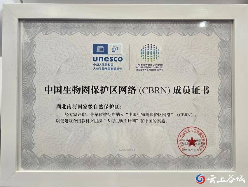 9月22日,第五届世界生物圈保护区大会在杭州开幕。湖北南河国家级自然保护区获颁“中国生物圈保护区网络(CBRN)”成员证书,保护区管理局党组书记、局长邓婕现场接受授牌。此举标志着南河保护区正式加入中国生物圈保护区网络,成为襄阳市首个入选该全国性生态保护平台的自然保护地。