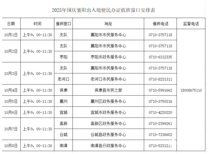 同时,国庆节期间,襄阳公安还将针对紧急出入境需求开通绿色通道,如遇紧急事项请联系12367、18008675110。