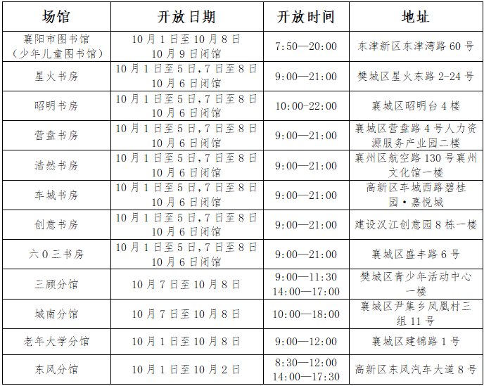 襄阳市图书馆2025年国庆、中秋假期(10月1日至10月8日)将正常开放,10月9日闭馆一天进行馆内整理。期间,市图书馆不仅主馆和分馆照常接待读者,还将开展系列文化主题活动,具体开放时间及活动安排如下: