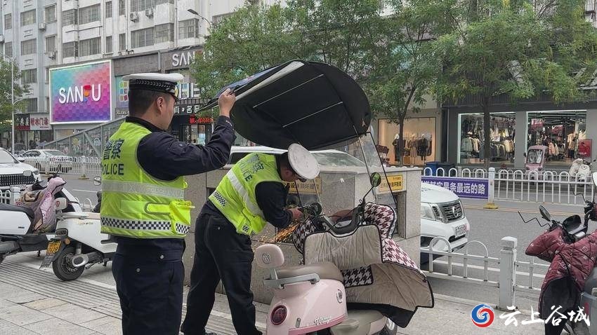 此次行动聚焦城区道路交通突出问题,在粉水路、银城大道等商业核心区,采取“定点检查+流动巡逻”模式,实施精准查纠。执法过程中,对非法加装的遮阳伞(篷)一律现场拆除、收缴;对未佩戴安全头盔、逆向行驶等行为,立即现场纠正并开展安全教育;同时严查无牌无证、闯红灯、非法改装等各类交通违法行为,及时消除安全隐患。