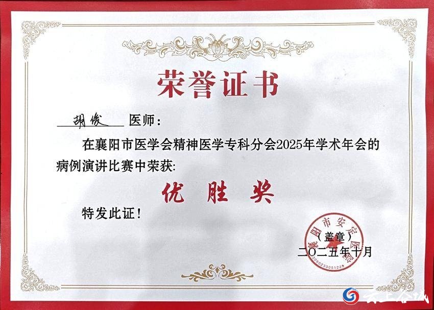 近日,在2025年襄阳市医学会精神医学专科分会第二届病例演讲竞赛中,谷城县人民医院精神心理科胡俊凭借个案“一例老年患者术后反复谵妄的MDT诊疗体会”,历经多轮激烈角逐,荣获优胜奖。