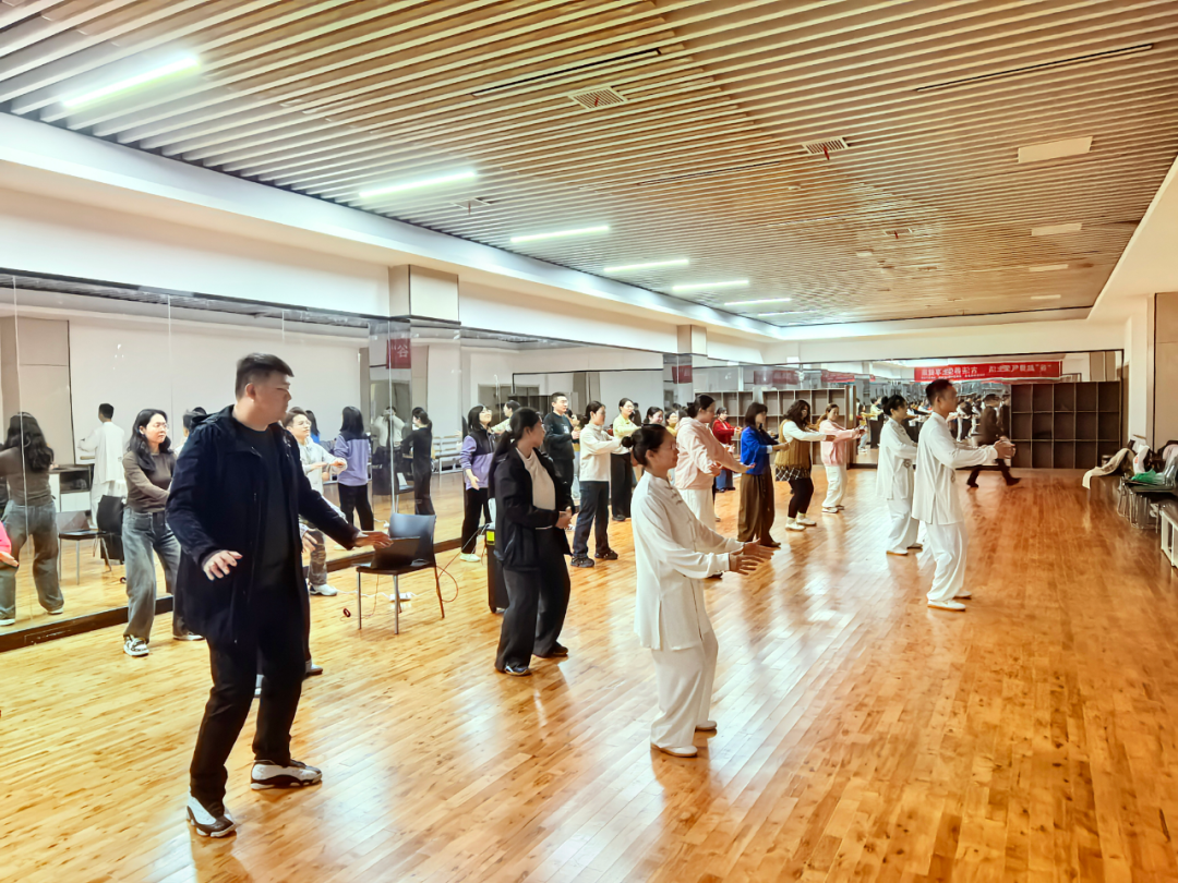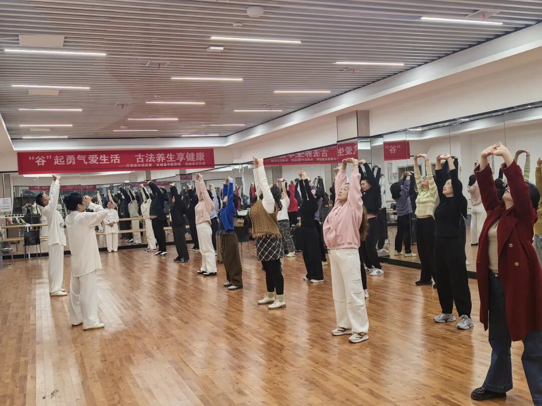 宽敞明亮的活动厅里气氛热烈非凡。“双手托天理三焦”“左右开弓似射雕……”三位教练一边讲解口诀,一边细致入微地示范每一节的身形、手法、步法以及动作细节。他们目光专注,对学员们的每一个动作都认真观察,一旦发现问题便耐心纠正,确保学员们能够掌握正确的动作要领。学员们微蹲马步,认真聆听教练的讲解,仔细模仿每一个动作。在教练的悉心指导下,大家逐渐掌握了八段锦的基本动作,举手投足间尽显对传统养生文化的热爱与追求。