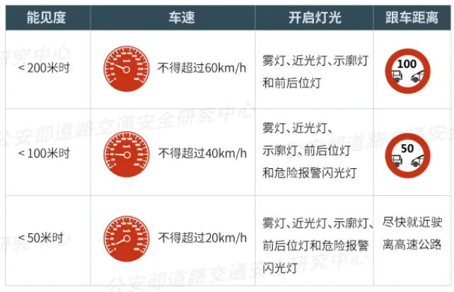 能见度小于100米时,开启雾灯、近光灯、示廓灯、前后位灯和危险报警闪光灯,车速不得超过每小时40公里,与同车道前车保持50米以上的距离;