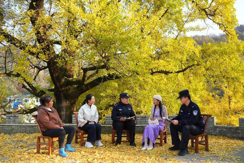 11月5日,谷城县茨河镇胡家泉村的千年银杏树正值金叶满枝的最佳观赏期,吸引了各地游客纷至沓来,感受“千年风华映金辉”的独特景致。为筑牢反诈防线,县公安局茨河派出所推出“旅游警务+反诈宣传”模式,将反诈课堂搬到银杏树下,让防骗知识随秋风传递到每一位游客心中。