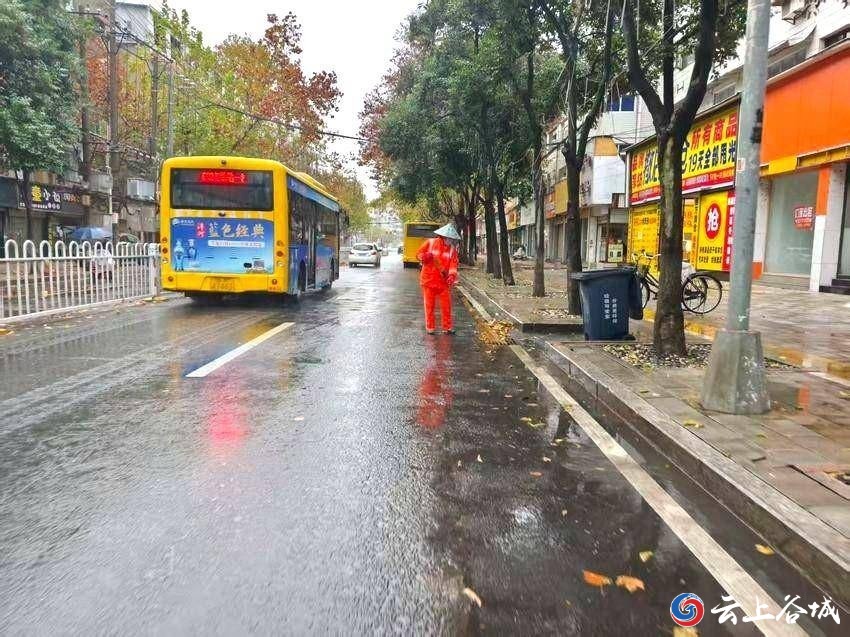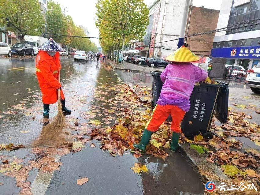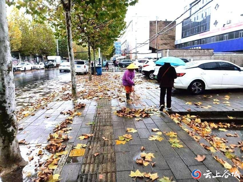 11月17日,谷城县迎来降温大风降雨天气,城区主次干道、人行道被大量落叶覆盖。雨水裹挟着落叶堆积在路面,既影响市容市貌,又给市民出行带来安全隐患。为保障城市环境整洁有序和群众出行安全,环卫工人们在雨中开展落叶清扫行动。