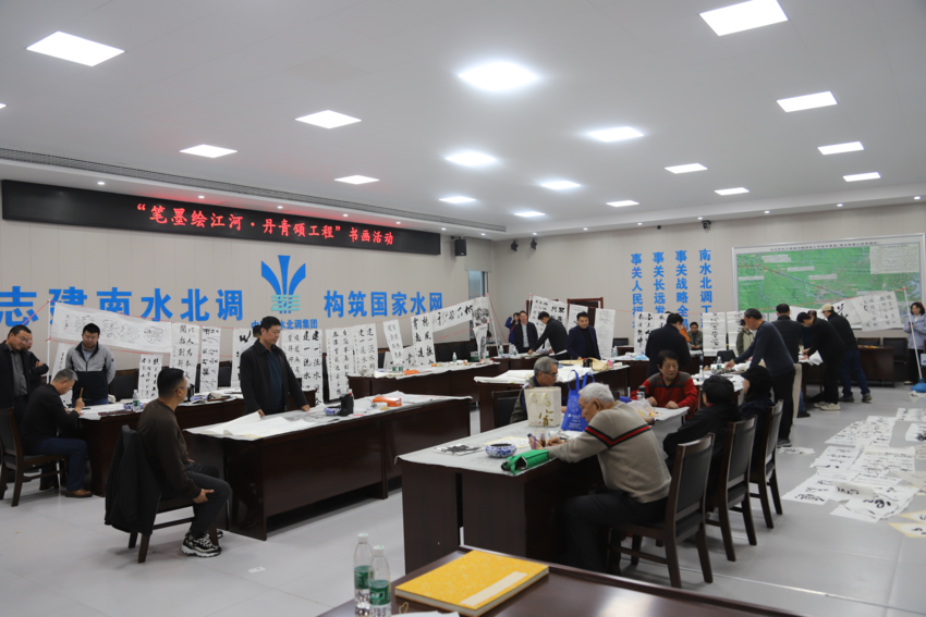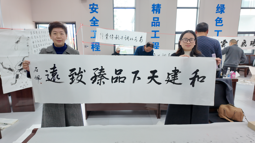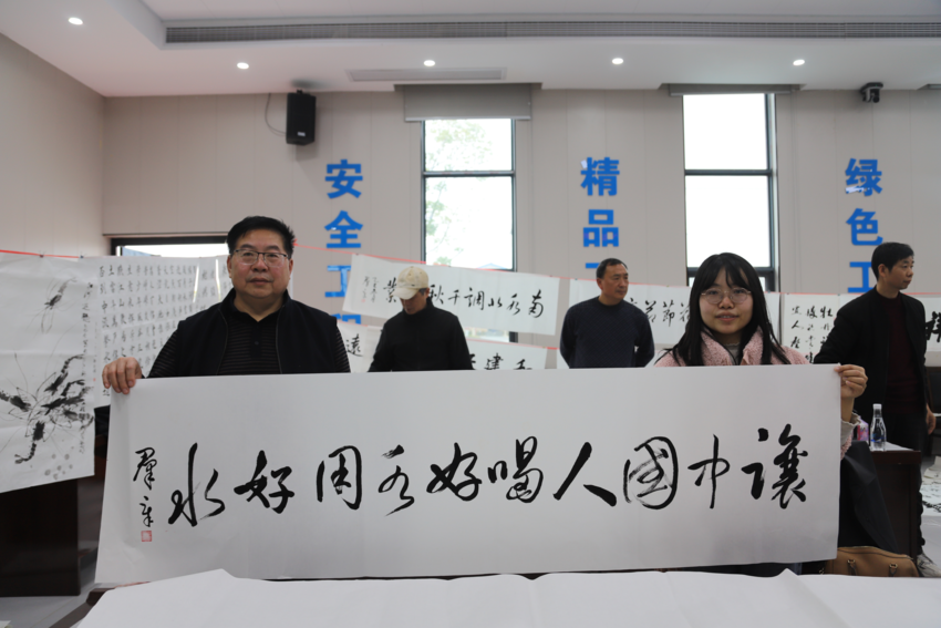 在土建8标多功能会议室内,书画创作持续了4个多小时。两地艺术家们围绕“安全、精品、绿色、智慧、阳光”5个工程主题,创作了书画作品100多幅。艺术家们高超的技艺、精美的作品不时激起员工们的赞叹。
