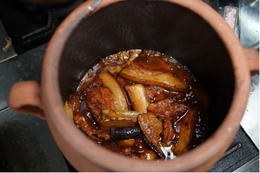 若论乡土风味,则不得不提堰河腊蹄子。这道源自五山堰河村的传统美食,选用本地散养黑猪。腊蹄色泽红亮,肉质紧实,与山笋、干豆角同炖,腊香浓郁,胶质丰厚,是逢年过节、宴请宾客的压轴硬菜,承载着山里人家待客的厚意与乡土的淳朴。