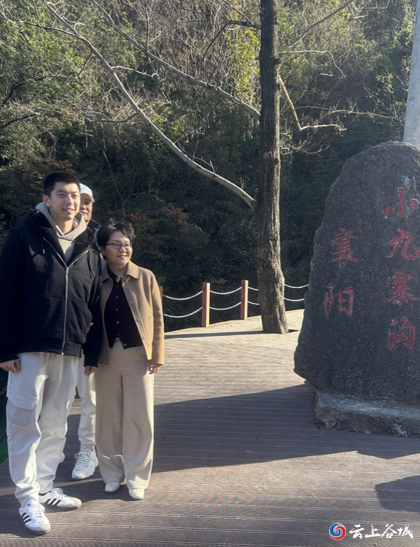 顺着溪流前行,闫子贝来到了被誉为“襄阳小九寨沟”的核心景点。站在亲水平台上,眼前是一汪蓝绿交织、明镜般纯澈的溪水。山色树影倒映其中,宁静而美丽。为他提供了一份难得的松弛,也让他见识了家乡水资源另一重动人的面貌。闫子贝和朋友一起在地标处拍照打卡。
