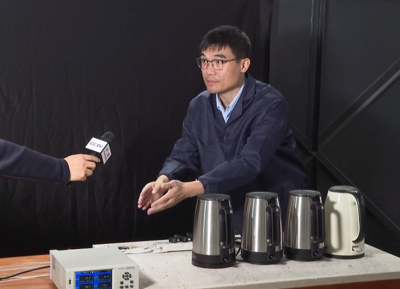 消防员先将4个1800瓦的烧水壶插在2500瓦的插线板上,并把插线板电线捆扎在一起,四个水壶同时工作,用测温仪实时监测插线板电线的温度。