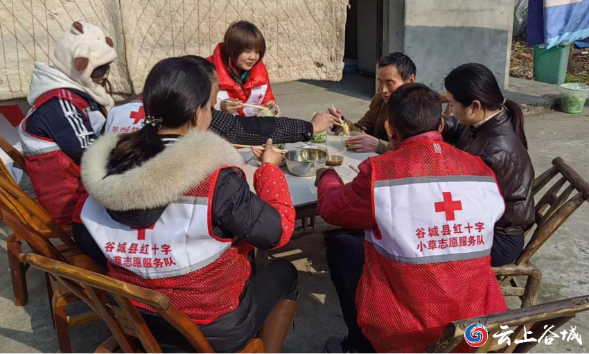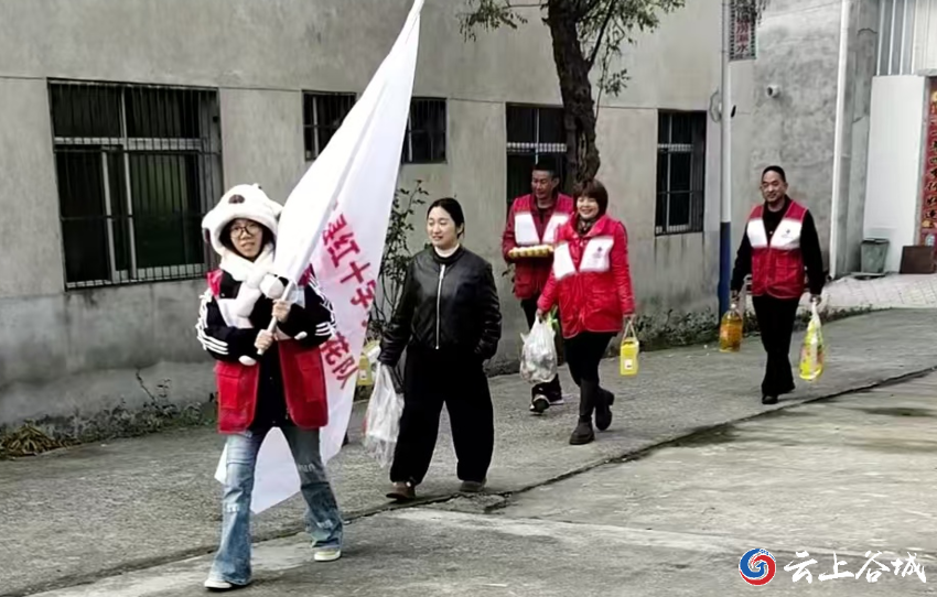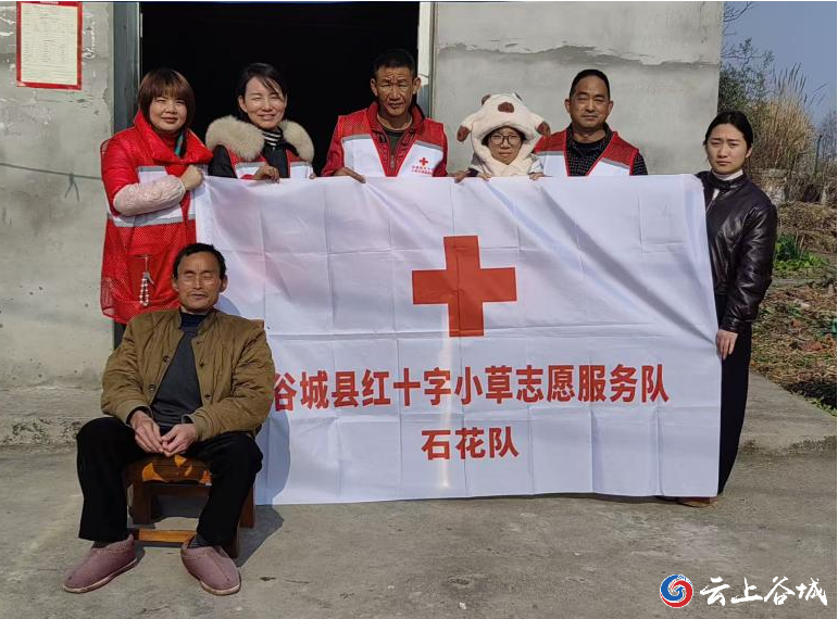 12月17日,谷城县石花镇周家湾村联合县红十字会小草志愿服务队石花队,开展困难群众帮扶活动。志愿者们携带米面油等物资走进村民张万清家中,鲜红的红十字会旗帜在乡间格外醒目。