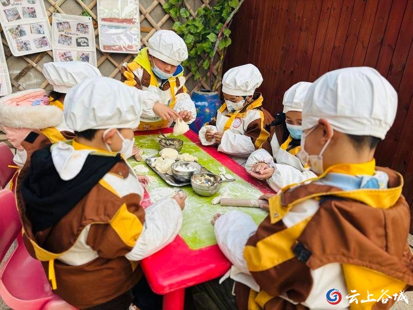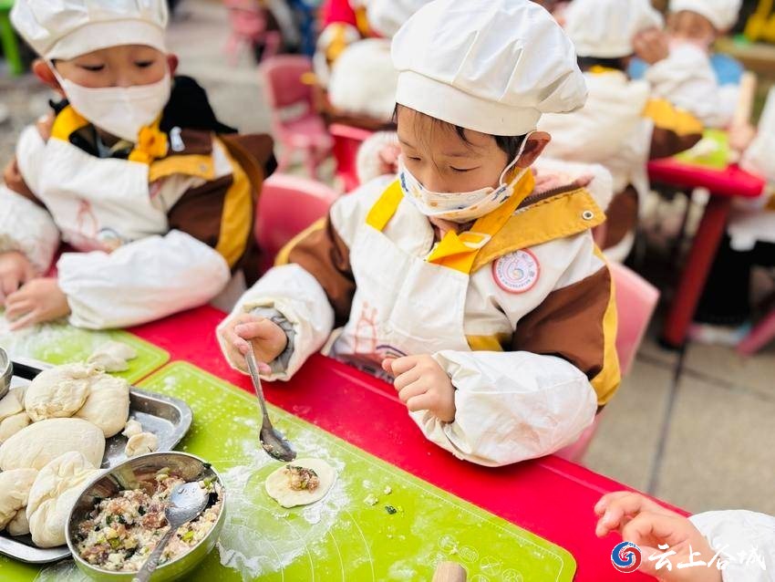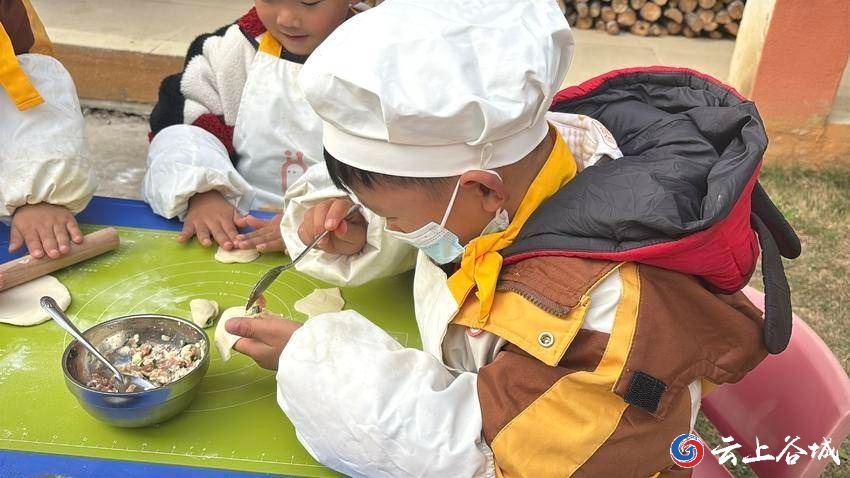 活动现场,孩子们头戴洁白的厨师帽,身着围裙,一个个有模有样。在老师的指导下,他们先是拿起擀面杖,认真地将面团擀成圆圆的面皮,小手虽稚嫩,动作却格外专注。随后,孩子们用小勺舀起馅料,小心翼翼地放在面皮中央,再学着捏合、塑形,一步步完成面点制作。揉面、擀皮、包馅,每一个步骤都凝聚着孩子们的用心,现场满是童真与欢乐。