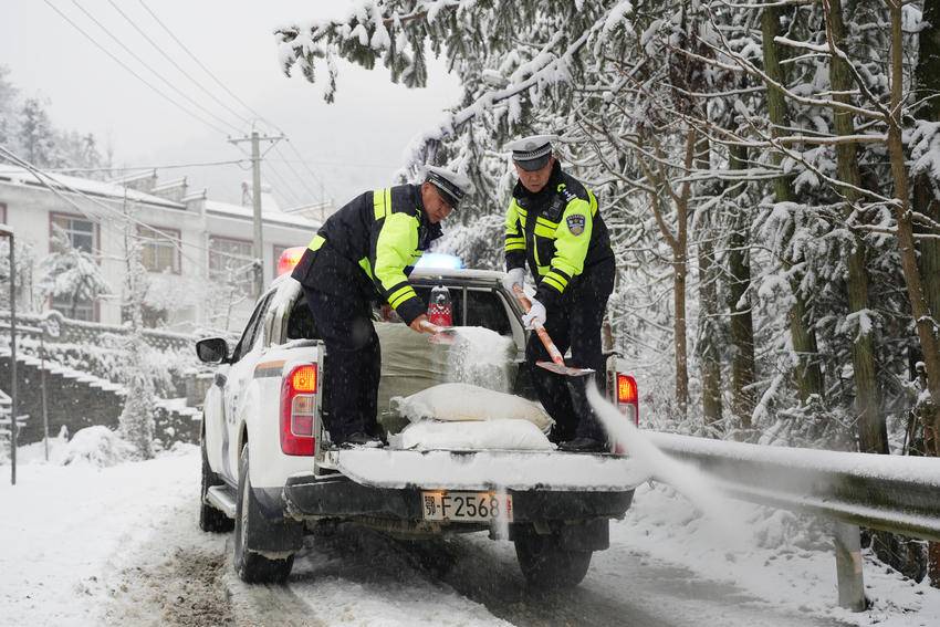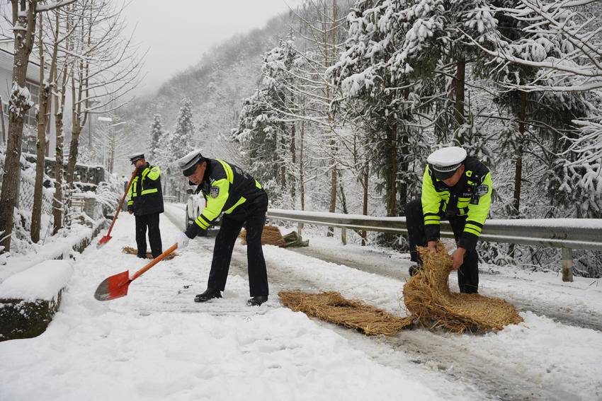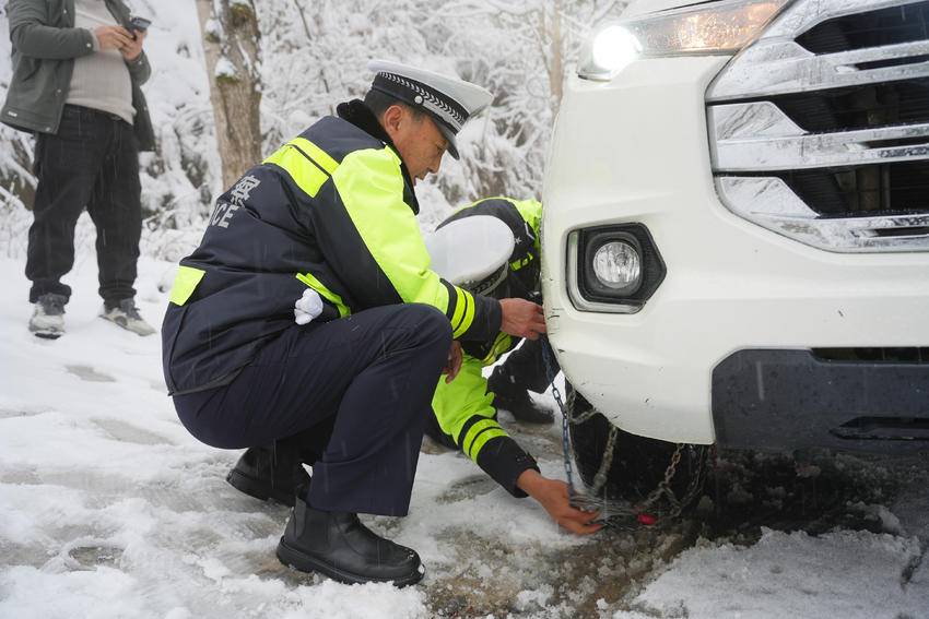 针对山区积雪结冰较重路段,谷城交警实行“定点值守+动态巡逻”相结合的管控模式,重点加强对危险路段警力部署。在275省道赵湾段等积雪严重的山区路段,民警采取“警车开道+徒步巡查”的方式,引导车辆缓慢通行。对急弯、陡坡等危险点位安排专人值守,人工铲除路面积雪,并设置安全警示标志。发现有车辆打滑或被困情况,交警第一时间上前帮助脱困,并指导驾驶员安装防滑链,提醒他们减速慢行、谨慎通过。