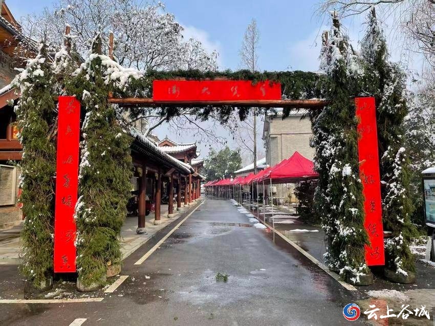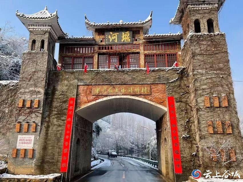 雪后的堰河村银装素裹,皑皑白雪将“中国最美休闲乡村”点缀得诗意盎然,古村韵味与节日氛围交融,楹联与雪景相映成趣。