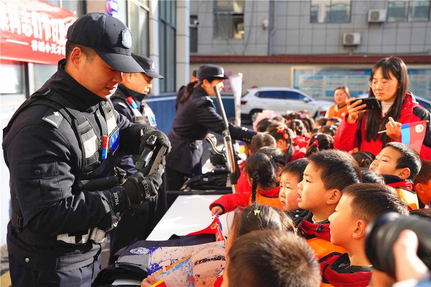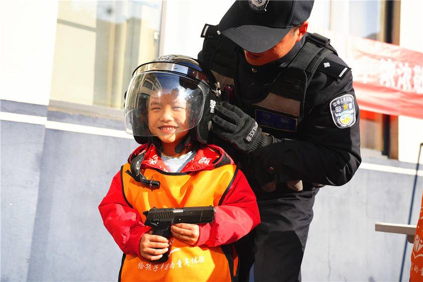 警械展示环节成为此次活动的焦点。防暴头盔、防弹盾牌、伸缩警棍、对讲机等平日里难得一见的警用装备整齐陈列,民警逐一演示讲解装备的用途和使用方法。萌娃们好奇地围上前,在民警的指导下轻轻触摸、尝试穿戴,一个个摆出“小警察”的帅气姿势,现场欢笑声不断。