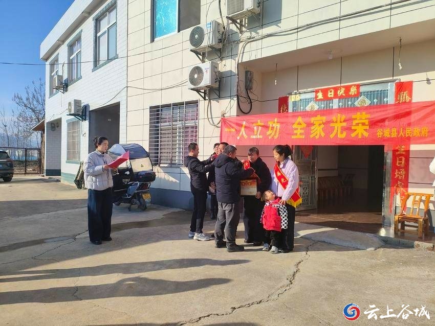 1月9日上午,谷城县退役军人事务局、县人武部、石花镇政府联合组成慰问组,先后前往凉水井村、巩湾村,为荣立三等功的现役军人魏健、卢银虎家庭送去立功喜报与奖励金,让军人、军属共享荣光。