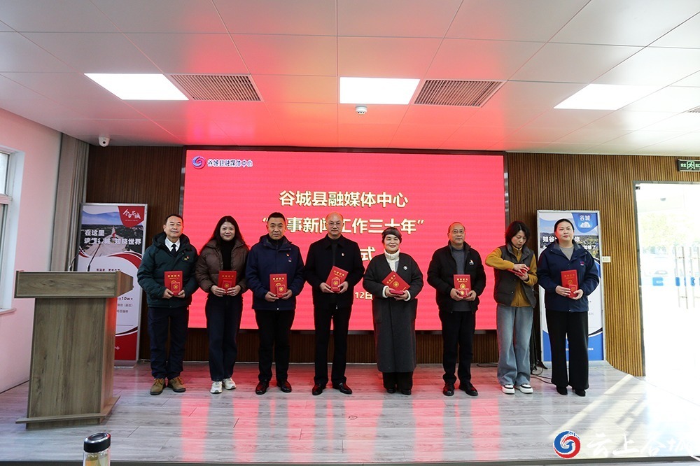 三十年风雨兼程,8名资深新闻工作者始终践行“脚力、眼力、脑力、笔力”,用镜头定格时代变迁,用笔墨记录民生温度,采写出一大批“沾泥土、带露珠、冒热气”的优秀作品,见证了谷城发展的动人历程。中心领导逐一为他们颁发证书和奖章。一枚枚奖章闪耀初心,一本本证书承载坚守——这是对他们在新闻一线践行使命的最高褒奖,也是对那段用青春热血书写时代篇章的光阴的真诚致敬。