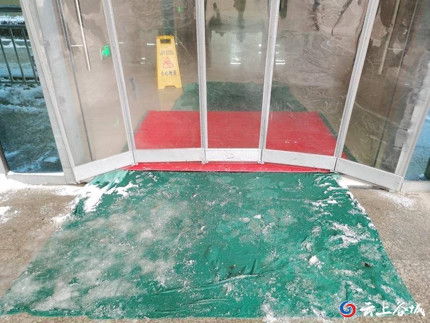 在门诊大厅入口、住院部入口和急诊、门诊的台阶等处,医务人员铺上防滑垫(布),防止人员滑倒。在车辆进出的通道,医务人员争分夺秒铲除障碍。