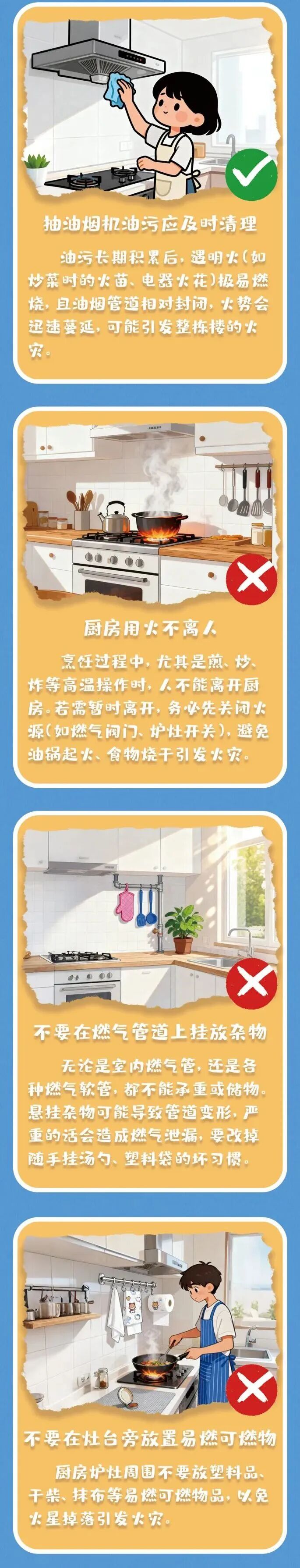 厨房常年环境比较潮湿,在这种条件下,燃料燃烧过程中产生的不均匀燃烧物及油烟很容易积累下来,形成一定厚度的可燃物油层和粉层附在墙壁烟道和抽油烟机的表面,若不及时清洗,就有引起火灾的可能。