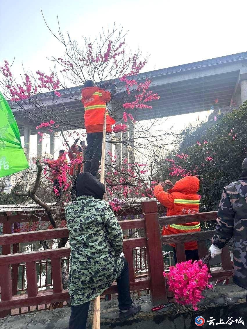 在紫金镇的主干道旁、桥梁周边,随处可见工作人员忙碌的身影。身着“紫金环卫”工作服的环卫工人与志愿者们分工协作,有的站在木梯上为树木绑扎仿真花束、有的手持工具整理枝条、有的搬运布置材料……现场一派热火朝天的忙碌景象。原本萧瑟的树枝上,一簇簇鲜艳的玫红色花束错落点缀,在冬日的暖阳下格外醒目,与一旁的绿植相映成趣,提前勾勒出新春的盎然生机。