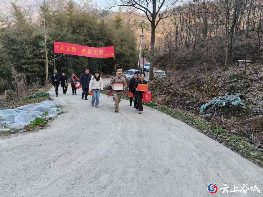 锣鼓铿锵庆荣誉,横幅高悬暖人心。2月2日,由谷城县人民武装部、县退役军人事务局和紫金镇退役军人事务办组成的慰问组,先后为紫金镇现役军人罗炎、吴勇家属送上荣誉与关怀,营造了“一人立功、全家光荣”的浓厚氛围。