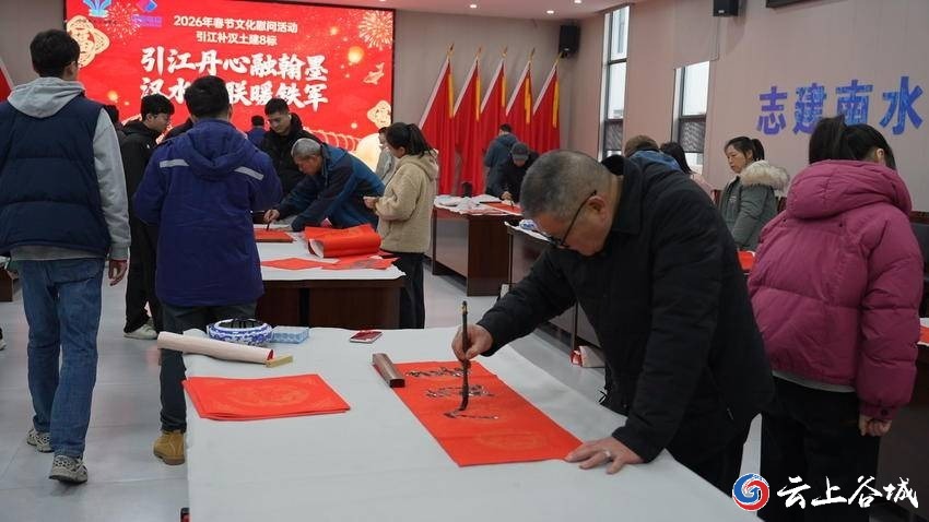 2月6日,谷城县总工会、县文联组织县书法家协会的文艺工作者,走进国家重大水利工程“引江补汉”8标段项目建设一线,开展“迎新春 送祝福”文化慰问活动,为坚守岗位的干部职工书写春联与“福”字,送上诚挚的新春问候。