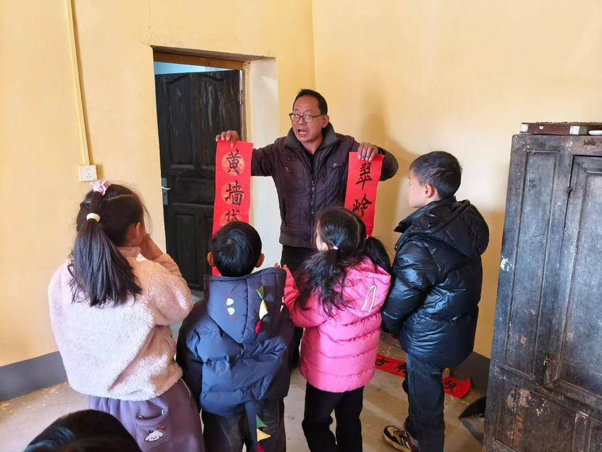 “父老乡亲们,帮忙拉猪喽!游客朋友们,放鞭升对联喽……”