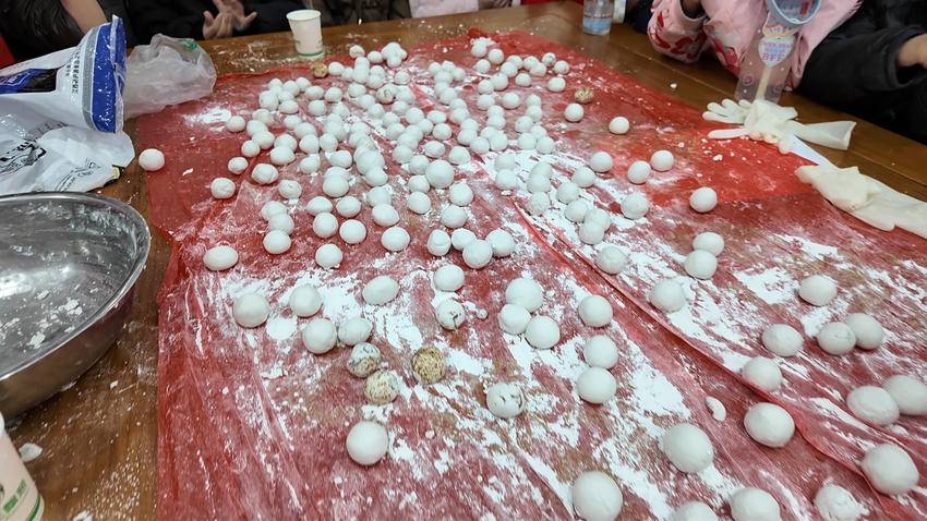 文化讲解结束后,包汤圆环节热闹开启。在家长和村民的陪伴下,孩子们洗净小手,围在桌前跃跃欲试。“先取一点糯米粉,加温水揉成光滑的小面团,再用大拇指按出一个小窝。”有着丰富经验的村民李阿姨耐心地示范着,手把手教揉面、捏窝、包馅、搓圆,步骤清晰、耐心细致。孩子们认真模仿,小手沾满糯米粉,模样憨态可掬;有的馅料偏多、汤圆“露馅”,引得全场欢笑;有的细心揉搓,做出圆润饱满的成品。家长一旁协助、邻里相互搭手,欢笑声、叮嘱声交织,暖意融融。