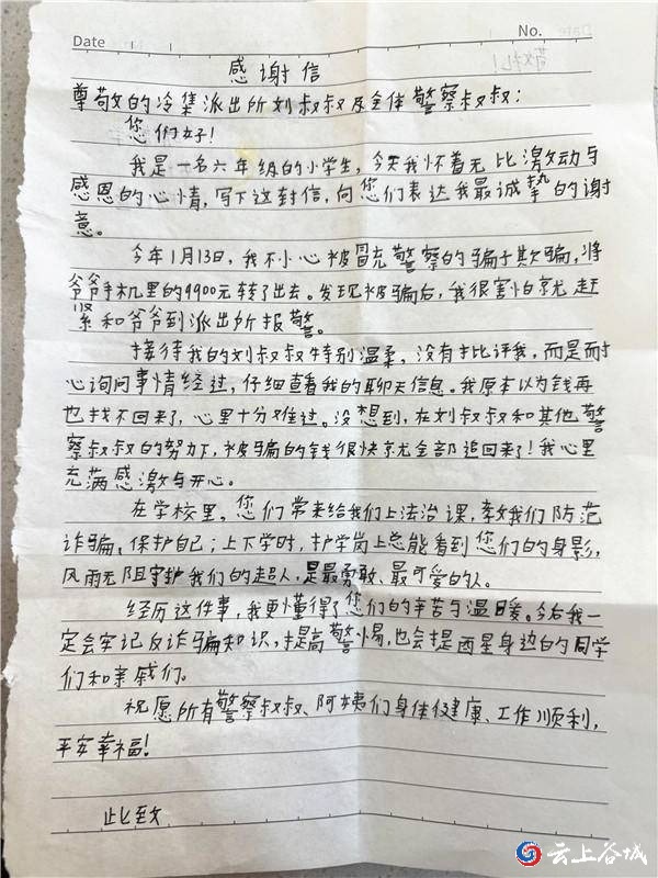 拿到失而复得的钱款后,小玥和家人激动不已。3月25日,小玥和家人特意将一面写有“破案神速解民忧,服务热情暖人心”的锦旗以及小玥亲手写的一封真挚的感谢信,一起送到民警手中,感谢他们尽职尽责、真心为民,用最快的速度帮家里挽回了损失。