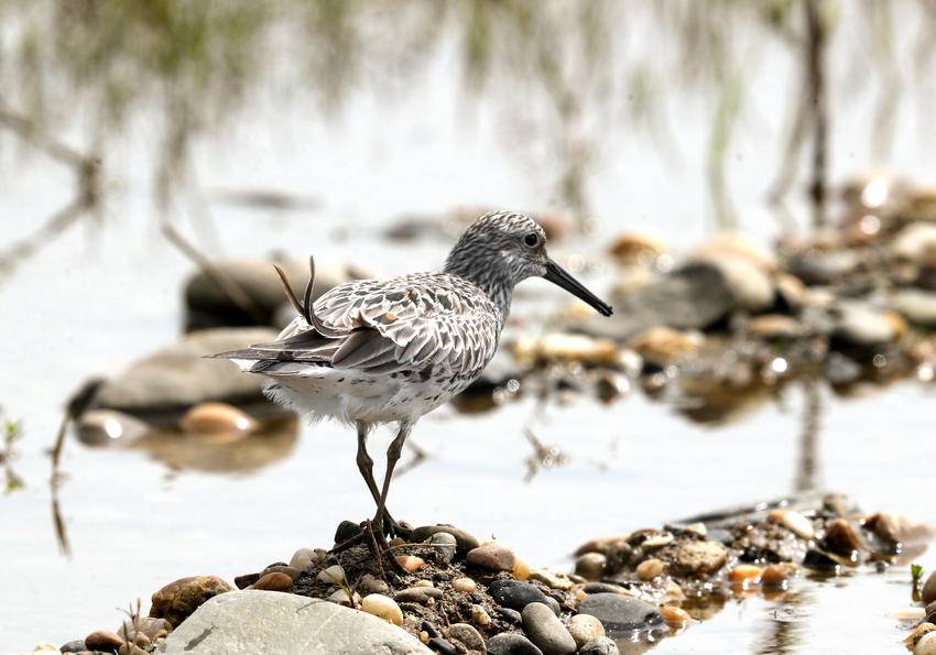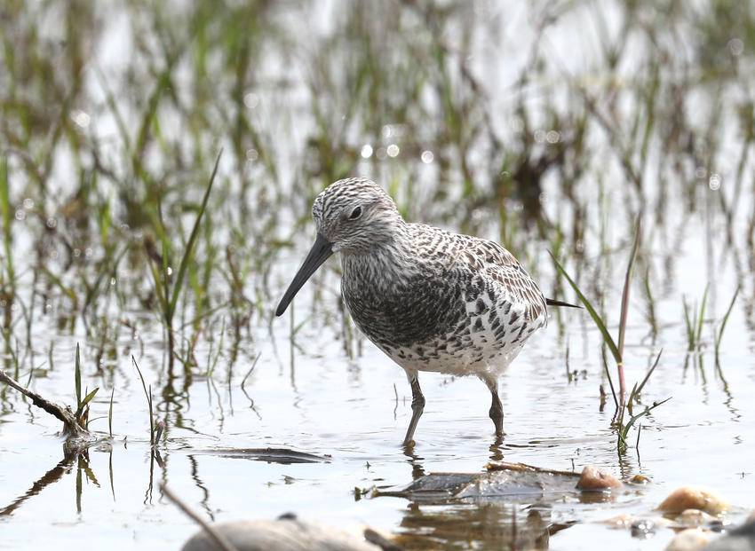 大滨鹬属于鸻形目丘鹬科滨鹬属鸟类,也是滨鹬中个体最大的种类,体长约26-30厘米,体重115-248克,翼展56-66厘米。嘴较长而直、黑色,脚暗绿色。羽色随季节变化,夏季头颈白色具黑色纵纹,背部黑色有白色或皮黄白色羽缘,肩带栗红色斑纹,下体白色且胸部布满黑色斑点;冬季上体转为淡灰褐色具黑色纵纹,腰和尾上覆羽白色微缀黑斑,前颈和胸有黑色斑。主要栖息于海岸、河口沙洲以及附近沼泽地带,以甲壳类、软体动物、昆虫等为食,对栖息环境的水质、生态完整性要求极高。被列入《国家重点保护野生动物名录》二级,同时被纳入世界自然保护联盟濒危物种红色名录——濒危(EN),具有极高的保护价值和生态指示意义。此次在谷城县境内发现大滨鹬,是当地生态环境质量提升的直观体现。