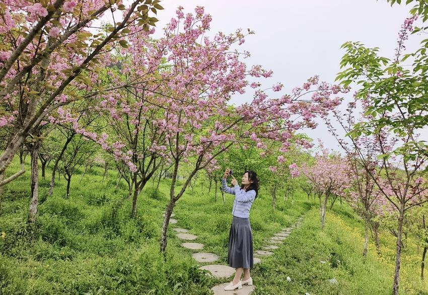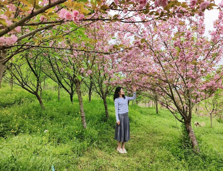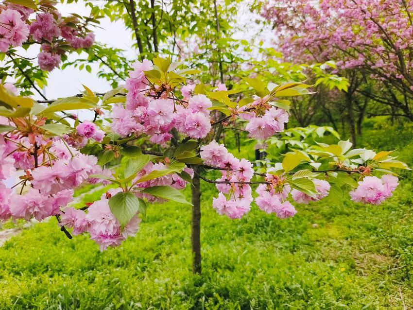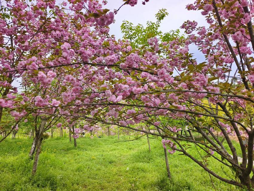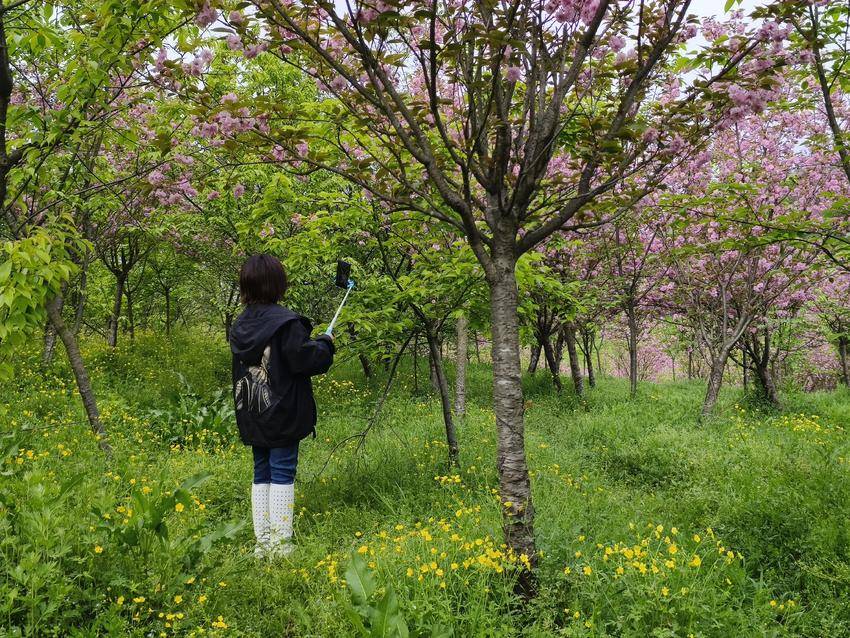 这粉色的浪漫,与周遭的景致相映成趣,更添几分灵动与鲜活。新生的绿草鲜嫩欲滴,带着蓬勃生机铺展林间,宛如一块柔软的绿毯。其间星星点点的黄色碎花,是藏在绿毯间的细碎星光,明黄的色泽清新明亮,与绿草交织出清新的底色。粉樱娇艳、绿草蓬勃、黄花灵动,三种色彩错落交织,宛如大自然精心调制的油画,浓淡相宜,层次分明。