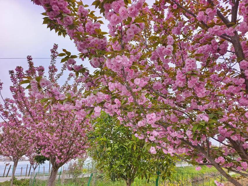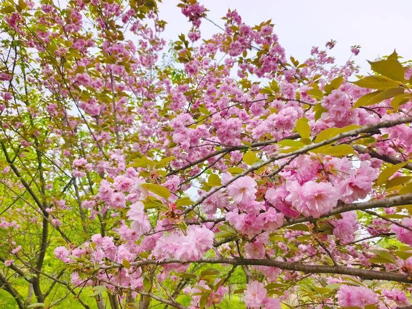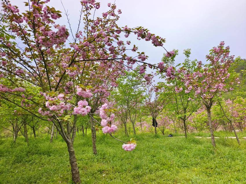 此刻的樱花谷,是晚樱的主场。花瓣重瓣饱满,质感温润如玉,粉晕轻染着素白,色泽既温婉又浓烈。密密匝匝的繁花缀满枝头,顺着山谷的脉络蜿蜒舒展,从林间小径到坡地崖边,从溪畔石旁到林荫深处,连绵成一片粉色云海。