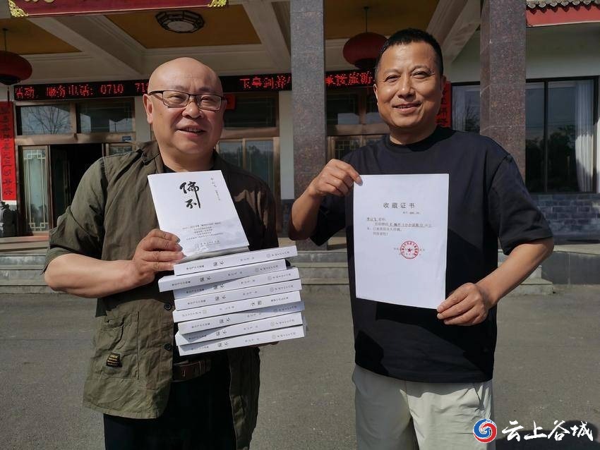 4月18日,宜城作家李云飞来到谷城县五山镇,向杜权成图书馆赠送了十册个人小小说集《偏不》,杜权成向李云飞回赠了书法作品和其主编的《五山民间故事集》。
