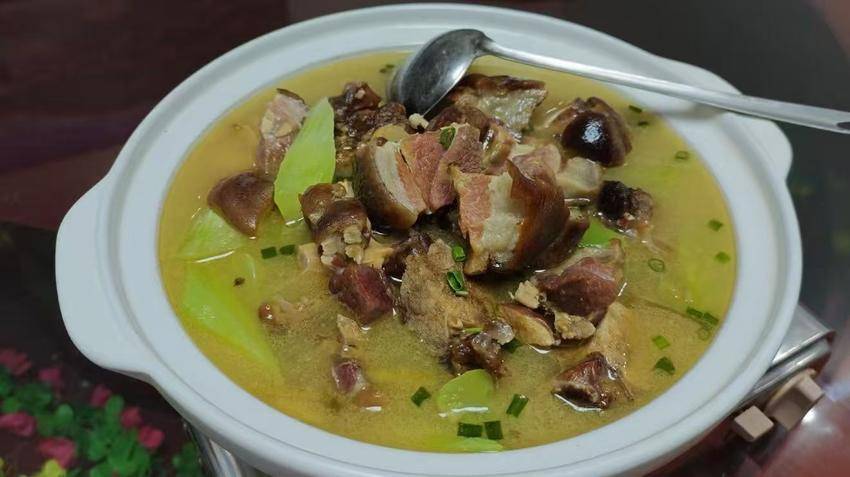 腊蹄锅作为赵湾腊味的灵魂代表作,采用传统工艺熏制的腊猪蹄,搭配高山莴笋慢炖,肉质紧实、咸香入味,莴笋吸饱肉香,解腻又下饭,尽显山野烟火气。