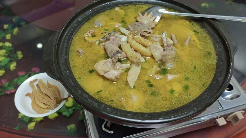 天麻土鸡汤选用本地散养土鸡搭配高山野生天麻,砂锅慢炖出的汤汁金黄清亮、油润鲜香,肉质紧实不柴,天麻的微苦与鸡肉的醇香完美融合,是兼具美味与滋补的必尝佳肴。